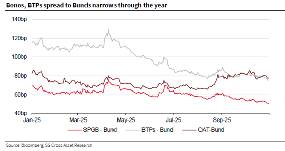 “Lo spread del BTP decennale rispetto al Bund tedesco si è quasi dimezzato in corso d’anno: da un picco di 130 punti base a marzo è sceso fino a circa 75 punti base a novembre”, spiega Paolo Baldessari, Responsabile Gestioni Income & Alternative Strategies per l’area Asset Management di Banca Generali. Nello specifico, questo trend favorevole è stato favorito da un insieme di fattori diversi, come stabilità politica interna e un orientamento favorevole della politica monetaria. “I titoli di Stato italiani hanno beneficiato dei tagli dei tassi operati dalla BCE, che nel corso del 2025 hanno raggiunto un totale di 100 punti base”, prosegue Baldessari.