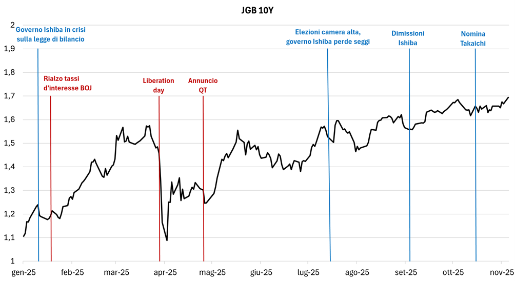 A questi fattori si è aggiunta la crisi del governo Ishiba e l’arrivo di Sanae Takaichi alla guida del Paese, “elementi che hanno generato incertezza sulle politiche fiscali future. Il nuovo governo guida una coalizione fragile, costretta a negoziare con l’opposizione su ogni provvedimento. Il nuovo pacchetto di stimolo e le proposte di revisione costituzionale hanno alimentato timori di aumento del debito e di tensioni geopolitiche”, continua il gestore di Banca Generali.
