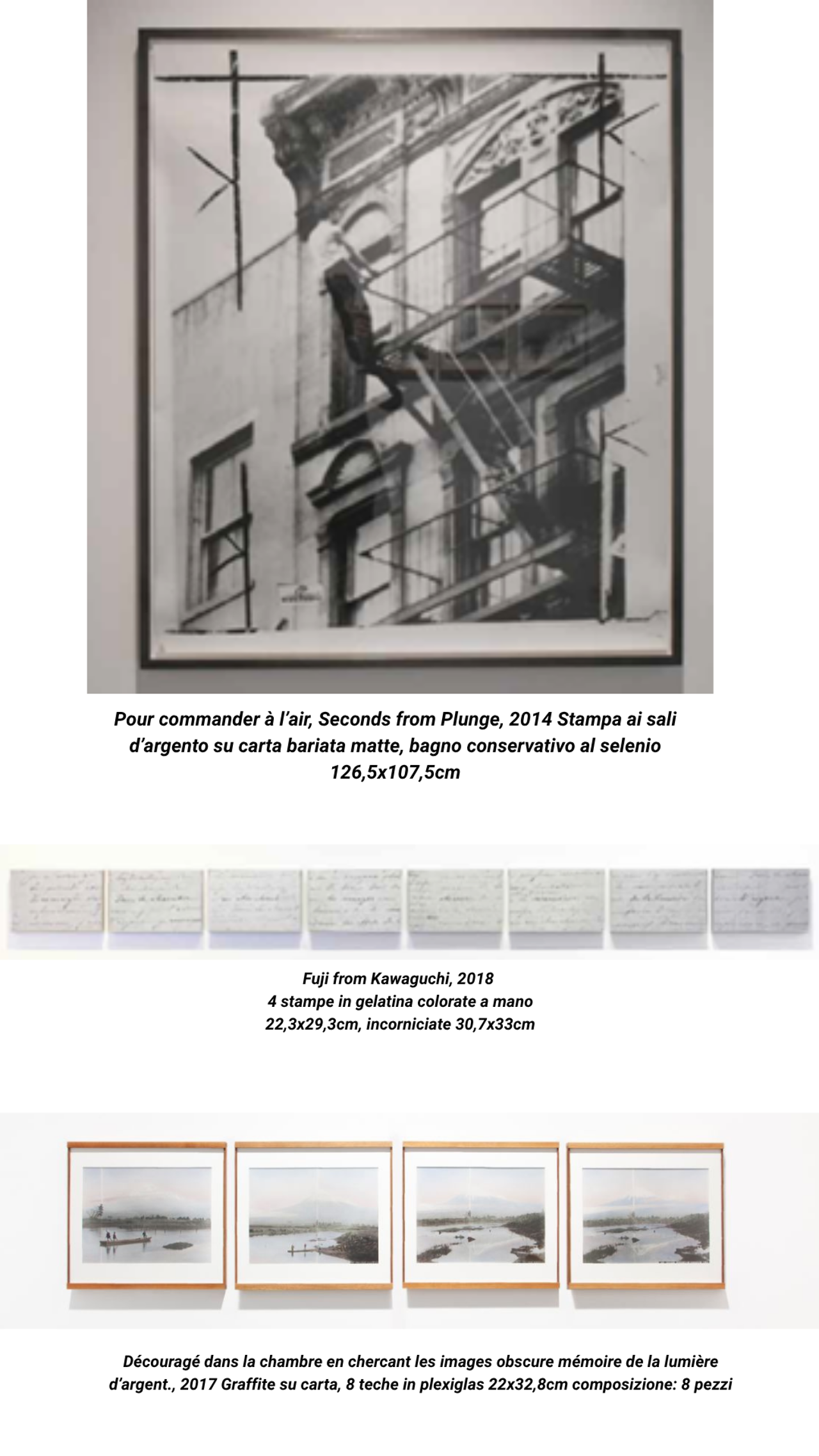 The piece is part of a series presented in Rome at the 2014 MAXXI Prize. Pour commander à l’air is a cycle of works composed of 15 photographs and three sculptures. The photographs come from the vast iconographic repertoire of 20th century news journalism. The originals, collected by the artist over the years, were re-photographed and enlarged in a darkroom. In the photographs, each figure is about to jump or is suspended in a precarious equilibrium. This theme is a reflection on time, suspension and the condition of absolute uncertainty created by the image itself: it reveals nothing of what happened before or after the moment of the shot.