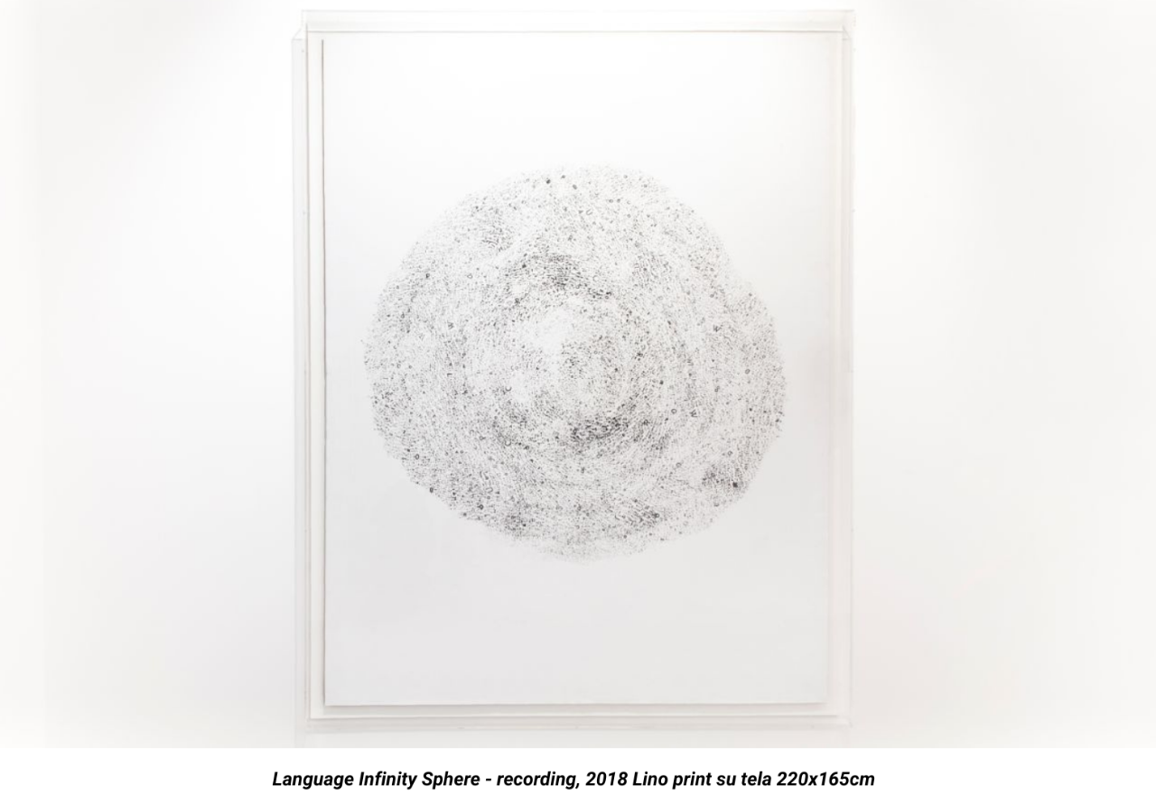 The work on display (Language Infinity Sphere - recording, 2018) is the result of a performative act executed using a steel ball covered completely in typographic characters made of lead, which were inherited from an Italian printworks that closed after forty years of business. With a unique and repetitive movement, the artist rolls that sphere over the canvas, creating a fragmented text that is print on the canvas itself. The work is a rebellion against the contemporary diluted language.