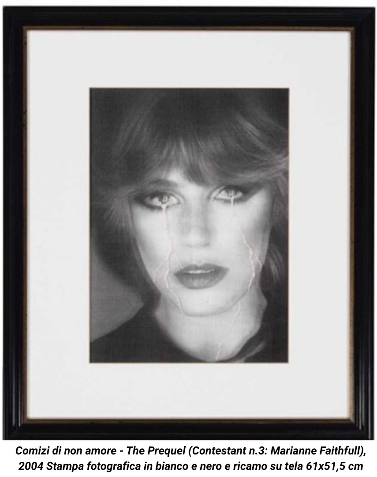 Ricche di citazioni e riferimenti che attingono tanto alla storia dell’arte, alla letteratura, quanto alla musica e ai reality show, le sue opere coniugano cultura “alta” e “bassa”, ibridando spesso il fascino senza tempo del cinema con il trash quotidiano del mondo televisivo. La produzione di Vezzoli è costellata, fin dai suoi esordi, di opere costruite intorno alle figure di dive e personaggi celebri, cui l’artista affida le sue riflessioni sull’ambiguità del vero, sul potere seduttivo del linguaggio e sulla fragilità dell’essere umano. Sebbene l’artista utilizzi un’ampia varietà di mezzi espressivi che spaziano dal video alla fotografia, dalla performance alla scultura, con una predilezione per il mezzo cinematografico, fin dagli inizi della sua carriera Vezzoli si è dedicato anche a una tipologia importante di lavori in cui impiega la tecnica del ricamo, applicandola a un ciclo di ritratti diventati tra i lavori più significativi e rappresentativi della sua produzione. Ne è un esempio iconico Comizi di non amore - The prequel (Contestant n.3: Marianne Faithfull), ritratto legato a una delle opere più note dell’artista, “Comizi di non-amore” concepita in occasione della mostra “Trilogia della morte” (2004) alla Fondazione Prada ispirata a due celebri lavori cinematografici di Pier Paolo Pasolini, Comizi d’amore (1965) e Salò o le 120 giornate di Sodoma (1975). In “Comizi di non-amore” Vezzoli reinterpreta la tradizione del documentario e del cinéma-vérité secondo i canoni più classici della televisione pop, trasformando il film inchiesta di Pasolini in un vero e proprio reality show in cui, come sempre accade nei lavori dell’artista, partecipano figure ‘cult’ come Catherine Deneuve, Antonella Lualdi, Terry Schiavo, Jeanne Moreau e Marianne Faithfull.