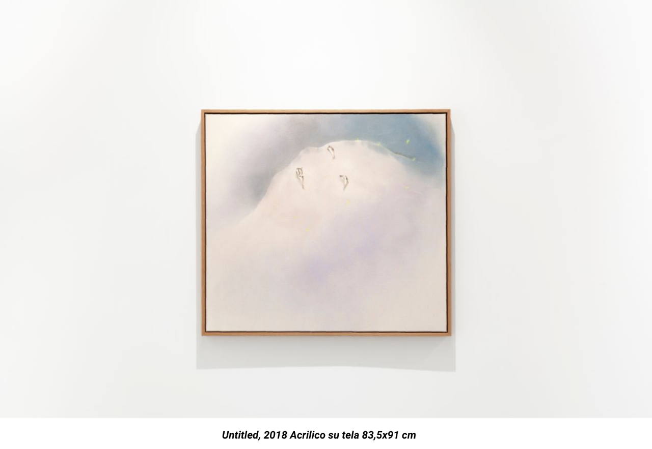 The painting shown here (Untitled, 2018) is an iconic example that reflects the circular process inherent in his art, in which the human form is modelled, remodelled and continually renewed. It is an enigmatic image, a representation of a human body, particularly of a face, that is ephemeral as it emerges almost like a cloud from the ether. Intangible and blurred, this image seems to appear out of nowhere, to then return to nowhere.