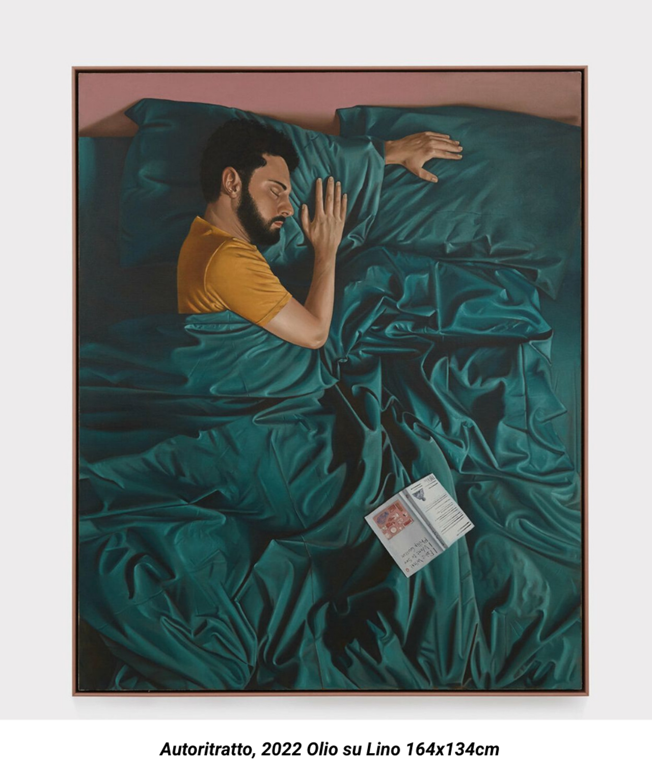 Il dipinto Autoritratto (con Philip Guston) si aggiunge alla serie di ritratti di persone dormienti che l’artista ha iniziato nel 2021, dove molto spesso è soggetto delle sue stesse opere. Nel quadro qui esposto Di Massimo si concentra su se stesso, assopito tra lenzuola di colore verde in compagnia solo di un personaggio elettivo. Appoggiato sulle coperte c’è infatti il libro “I paint what I want to see” del pittore statunitense Philip Guston. “L’autoritratto si compie quando c’è un coinvolgimento personale. In fondo la mia pittura è un racconto su di me. Io stesso, solo nello studio, faccio da modello. Ogni dipinto è una seduta psicoanalitica, e quello che faccio è mettermi a nudo di fronte al pubblico”.