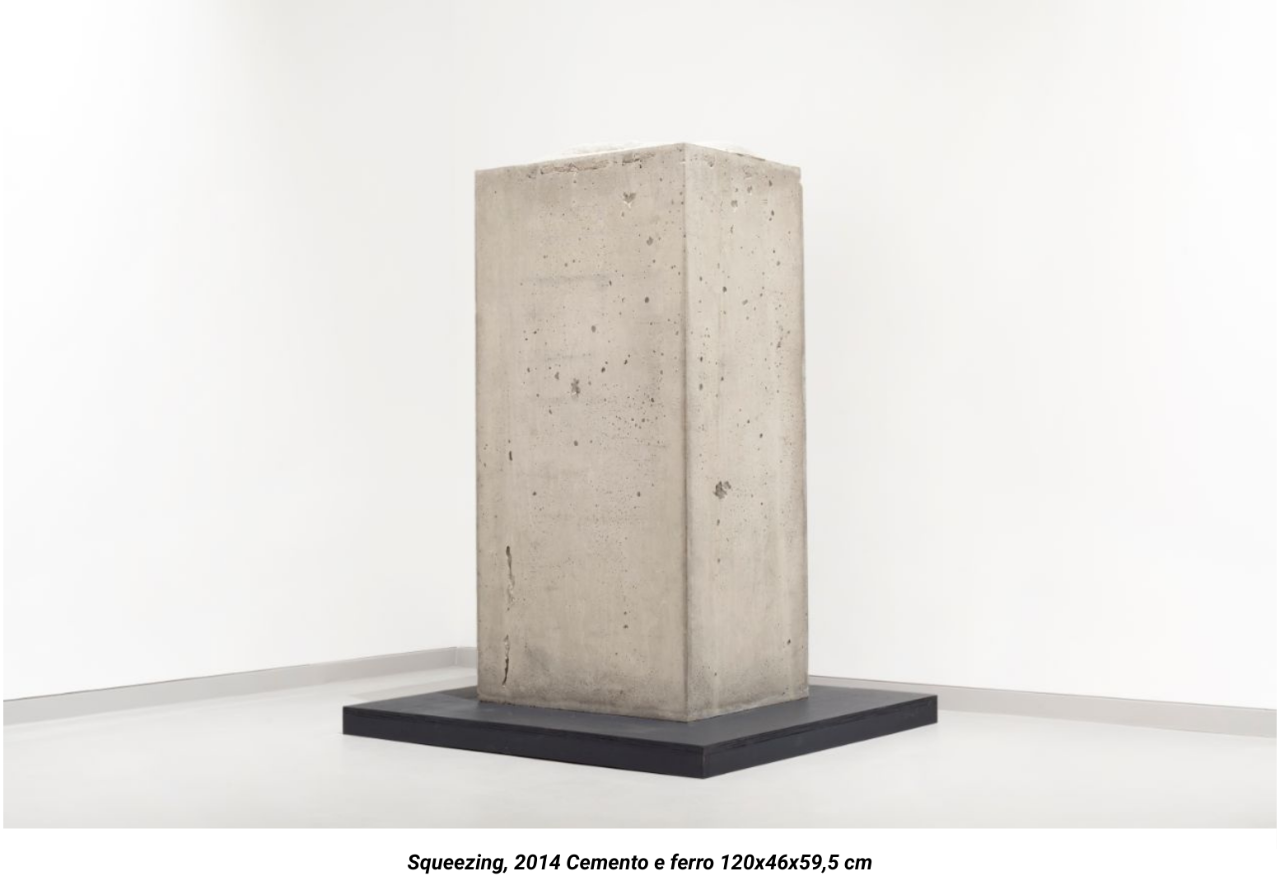 Since 2010, Lara Favaretto has added cement to her expressive lexicon, producing a series of markedly sculptural iconographies that include Squeezing, 2014, on display here. In order to explore the expressive potential and the twofold nature — solid and malleable — of this new medium, Lara perforates it and makes impressions in it with other objects when it is still fresh. The artist thereby freezes her actions and states of mind: the surface of these blocks, which harden gradually, is no longer smooth, thus revealing the transitory nature of the artistic process that is impressed upon the material and in the titles, which describe the action to which the blocks were subjected.