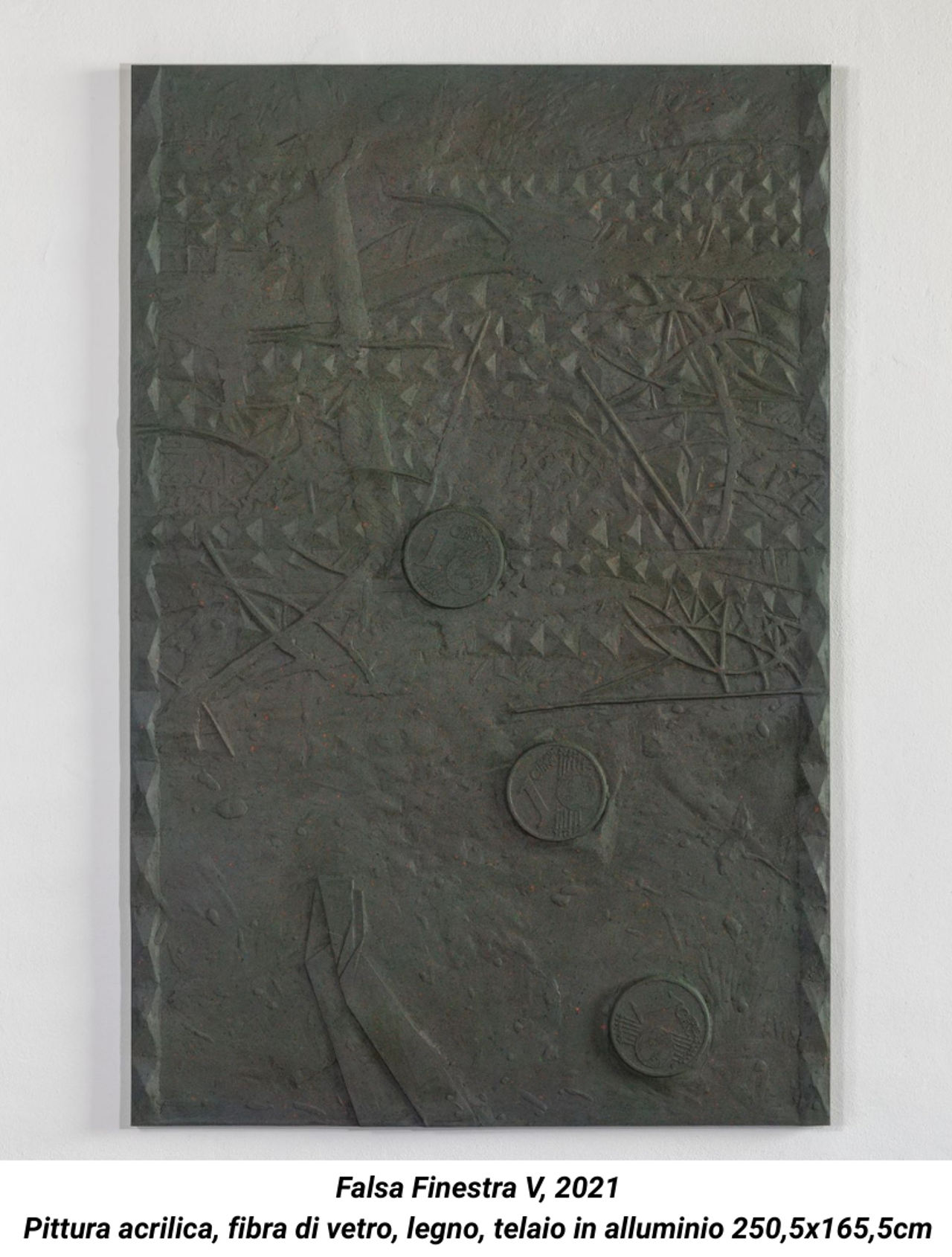 Elementi di questa indagine emergono nella serie di bassorilievi, realizzati attraverso una meticolosa tecnica con vernice acrilica, resina, fibra di vetro. Recuperando una tecnica scultorea antichissima, che dalle antiche civiltà mesopotamiche al Medioevo e al Rinascimento europei coniuga scultura e pittura, Gabellone indaga la dialettica tra la bidimensionalità della prima e la tridimensionalità della seconda, tra figurazione e astrazione, tra rappresentazione e ornamento. Si tratta di opere molto rappresentative della pratica dell’artista perché racchiudono molti aspetti chiave del suo lavoro, come l’attitudine a lavorare al confine tra linguaggi diversi, la riflessione sul rapporto tra astrazione e figurazione, la dialettica tra volume, immagine e percezione. Le forme del bassorilievo e dell'altorilievo, tra l’altro, non sono nuove nella produzione dell’artista, che già le aveva adottate nell’ opera esposta alla 50° Esposizione Internazionale di Venezia nel 2003. Il titolo Falsa Finestra, si riferisce al rapporto interno-esterno che la finestra implica ma allo stesso tempo ne sottolinea la natura artificiale: non si può realmente "guardare attraverso" queste finestre, e al contrario della “finestra aperta sul mondo” della pittura rinascimentale, non hanno niente a che fare con la verosimiglianza. Al contrario, la figurazione sembra addirittura scomparire negli abissi del colore e quello che rimane è una certa idea di paesaggio, che si delinea attraverso una serie di elementi che sembrano affiorare e affondare nella densa struttura della materia. È solo avvicinandoci che “entriamo” in questi paesaggi, riuscendo a percepire una serie di elementi invisibili a distanza, e come in un paesaggio il colore dominante è formato da una innumerevole serie di altri elementi colorati, guardando da vicino le opere di Gabellone scopriamo che il colore d’insieme è la somma di una molteplice combinazione di punti cromatici. Anche le forme che si intravvedono sembrano generarsi attraverso un meccanismo simile, affiorano da una serie di cancellature e riformulazioni e sembrano implicitamente nasconderne altre. Gabellone trova nel bassorilievo il luogo in cui si fondono astrazione e figurazione, decorazione e narrazione, pittura, scultura, e architettura, e i suoi lavori si inseriscono così in un discorso più ampio sulla simulazione e sulla rappresentazione dello spazio nell’arte contemporanea.