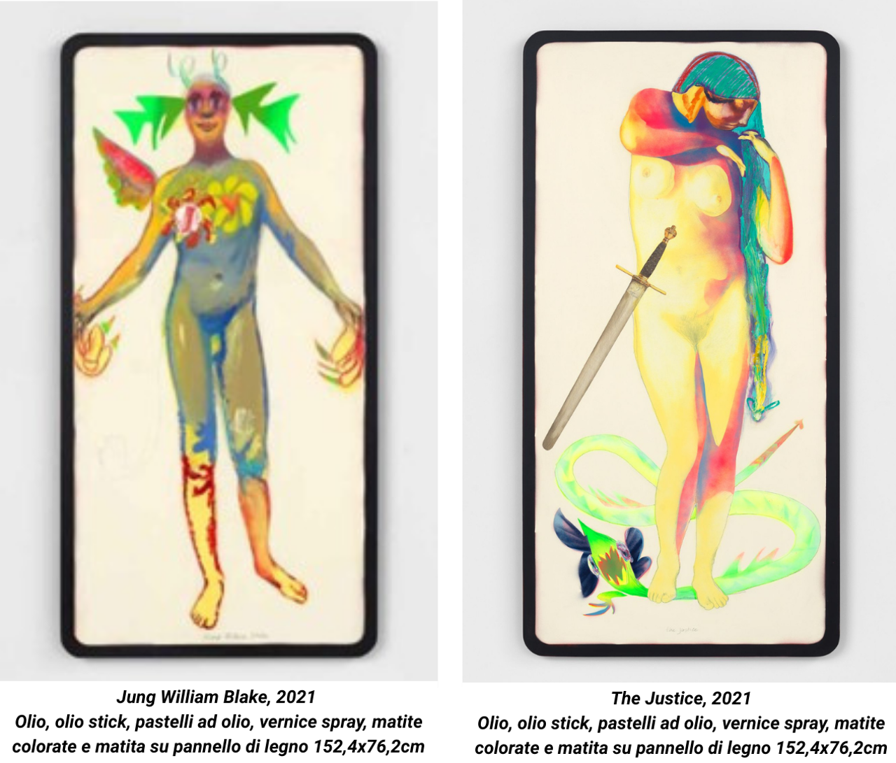 Nel dittico qui esposto The Justice, 2021 e Jung William Blake, 2021 l’artista è alla ricerca di un equilibrio fra disegno e pittura, leggerezza del segno che accenna velocemente le forme e la stratificazione densa di memorie tipica della pittura. I soggetti ritratti sono figure immaginarie maschili e femminili le cui pose classiche ricordano personaggi della Disney da una parte, e le illustrazioni della Divina Commedia di William Blake dall’altra. Le figure sono entrambe ritratte su uno sfondo volutamente bianco: non esiste ambientazione, ma una sola luce che rende ogni cosa leggibile.