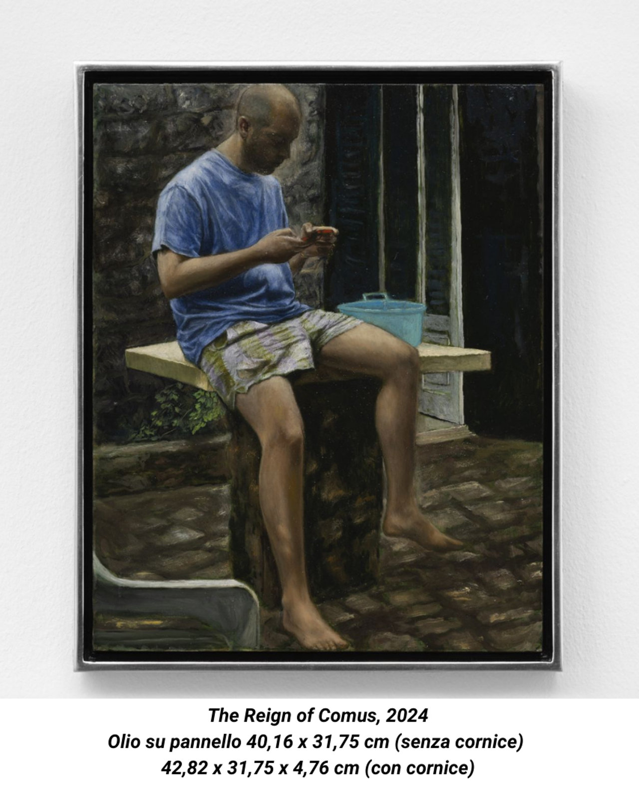 The Reign of Comus, 2024, è un esempio perfetto di questa contaminazione tra passato e presente, tra la storia dell’arte occidentale e la sua reinterpretazione attraverso uno sguardo contemporaneo che è la cifra distintiva del lavoro di Rossetti. Il dipinto ritrae un amico dell’artista in un contesto domestico, nel gesto quotidiano di guardare il cellulare. Da una parte la figura ha una posa classica, dall’altra l’abbigliamento e il contesto la trasformano in un personaggio che appartiene al nostro tempo.