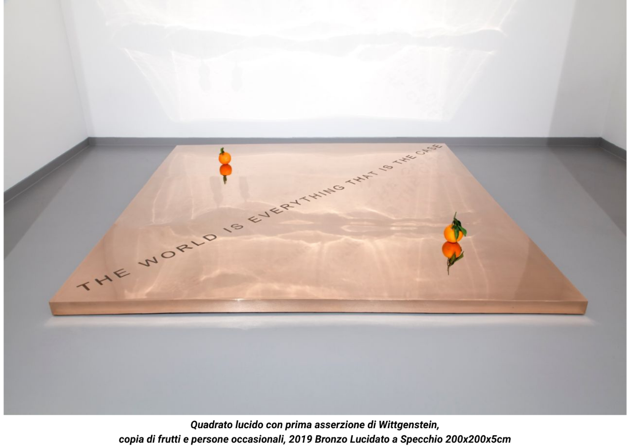 The work presented here consists of a square-shaped sheet of mirror polished yellow bronze. Over the diagonal of the surface, the artist has engraved the first of the seven propositions at the centre of Ludwig Wittgenstein’s Tractatus Logico-Philosophicus: The World Is Everything That Is The Case. A pair of fruits rest on the bronze plate - mute presences that have to be replaced over time. As the surface is mirror polished, anyone approaching the work is reflected in it and becomes part of it. The sculpture is therefore a collage of relationships linked by different times: the eternal one of the bronze and the engraved writing, the time of the relation between the plate and fruits that is motionless but finite, and the transient time of the reflection of those looking at the work.