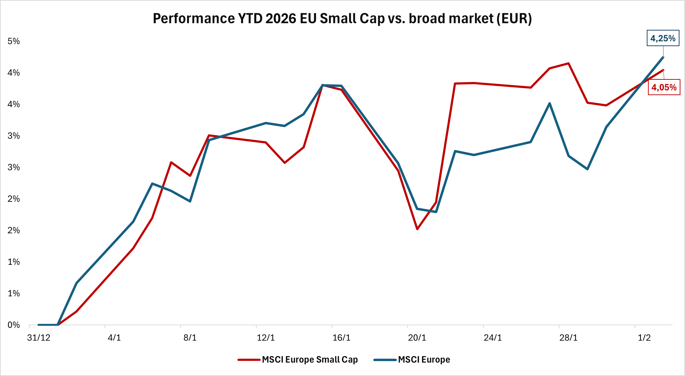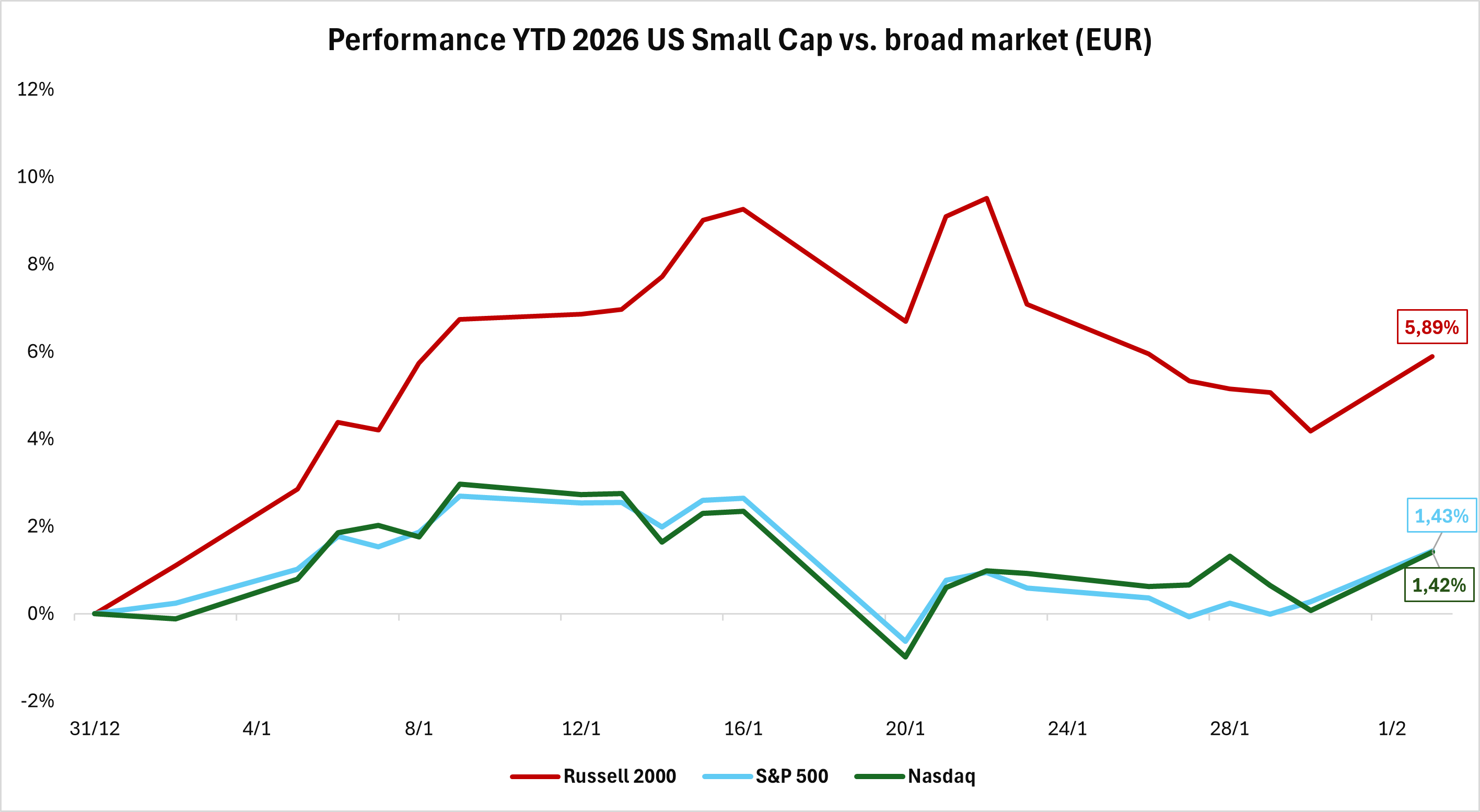 È l’ora della riscossa per le small cap? Dopo anni in cui a dominare le cronache finanziarie e a trascinare gli indici sono stati un piccolo numero di grandissimi gruppi internazionali, soprattutto del settore tech, all’inizio del 2026, le società a piccola capitalizzazione sono partite col turbo. Le società quotate a bassa capitalizzazione hanno evidenziato una dinamica particolarmente positiva negli Stati Uniti: l’indice Russell 2000, al 2 febbraio, ha registrato una performance pari al 6,5% in dollari (5,9% in euro), facendo meglio dell’S&P 500 e del Nasdaq (+2% in dollari ca. per entrambi).